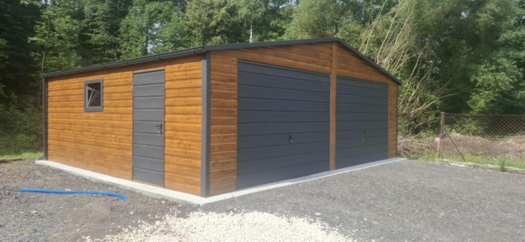 Ściany pokryte są blachą trapezową z tłoczeniem imitującym strukturę drewna, co nadaje im elegancki wygląd.