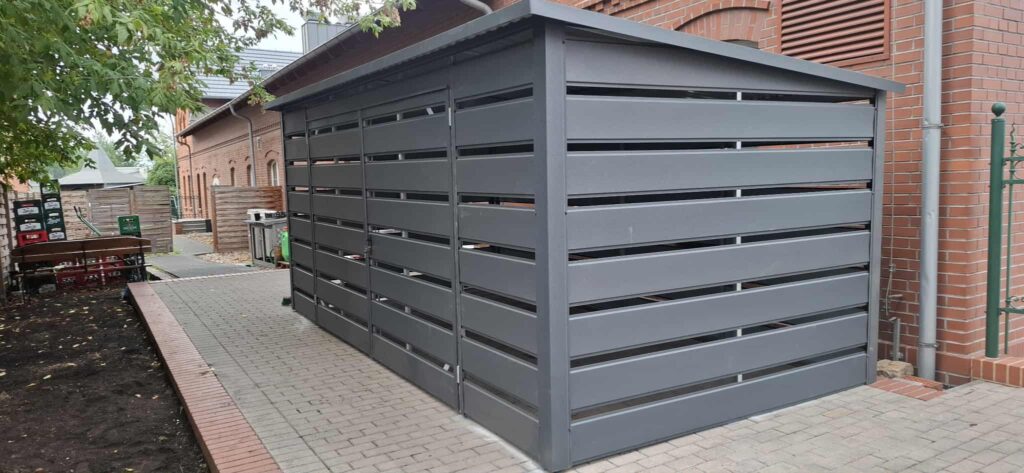 Wiaty śmietnikowe to nowoczesne rozwiązanie, które pomaga utrzymać porządek i estetykę otoczenia wokół domu, osiedla czy firmy. Konstrukcje wykonujemy z wytrzymałych profili stalowych oraz blach ocynkowanych lub akrylowych, dzięki czemu są odporne na deszcz, śnieg i promieniowanie UV. Wiaty można dopasować do koloru elewacji budynku, płotu czy ogrodzenia, tworząc spójną całość z otoczeniem.